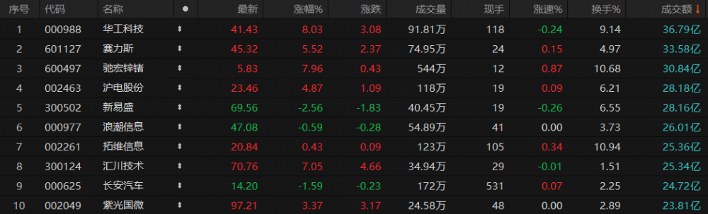 沪深两市半天成交额5310亿元,较上一交易日同期缩量331亿元。个股方面,截至午间收盘,华工科技成交额排名第一,达36.79亿元;赛力斯、驰宏锌锗成交额也在30亿元以上,分别为33.58、30.84亿元。
