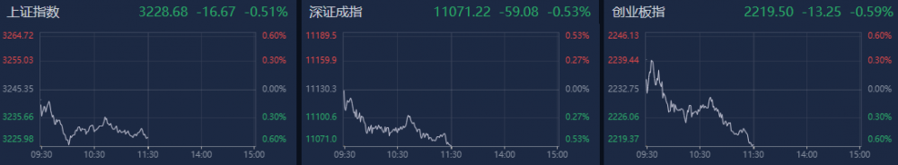 A股上午震荡走低,三大指数均跌超0.5%。南财金融终端显示,截至上午收盘,上证指数跌0.51%,深证成指跌0.53%,创业板指跌0.59%。沪深两市个股跌多涨少,近2800只个股下跌。