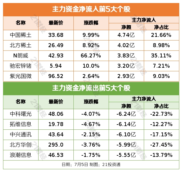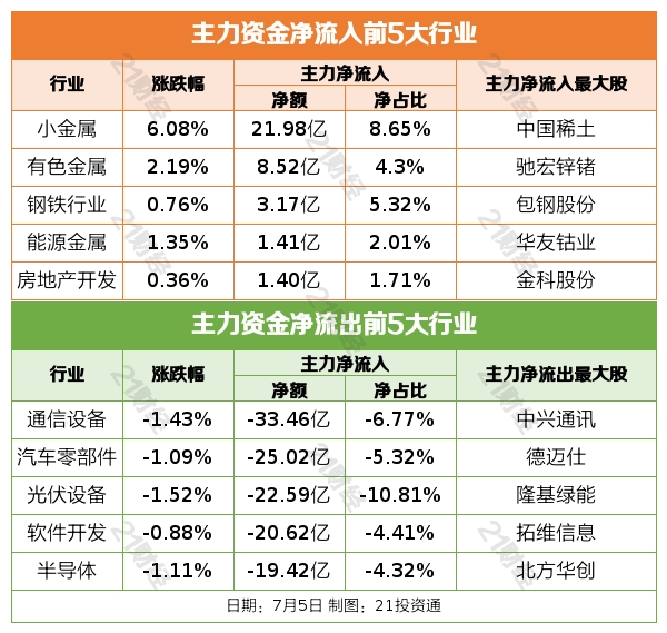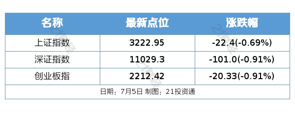 7月5日,大盘全天震荡调整,三大指数均小幅下跌。截至收盘,沪指跌0.69%,深成指跌0.91%,创业板指跌0.91%。盘面上,稀土、有色等周期股集体走强,其中稀土永磁板块逆势大涨,银河磁体、中科磁业20CM涨停,中国稀土涨停;小金属概念股再度活跃,东方钽业、云南锗业、驰宏锌锗、罗平锌电涨停。房地产板块盘中冲高,电子城、金科股份涨停。摘帽概念股午后走强,大连热电、国华网安等涨停。整体上市场热点较为零散,多数板块出现冲高回落走势。下跌方面,减速器概念股大跌,昊志机电、优德精密跌超10%,南方精工、襄阳轴承跌停。总体上个股跌多涨少,两市超3500只个股下跌。沪深两市全天成交额8678亿,较上个交易日缩量615亿。
