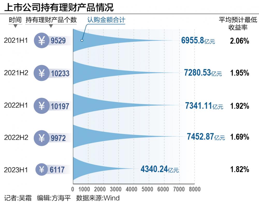 Wind数据显示,2023年上半年企业全部理财产品的平均预计最低收益率为1.82%;去年下半年为1.69%。但2023年上半年企业持有理财产品的个数却从去年下半年的9972只降至6117只,规模从7452.87亿元下滑至4340.24亿元。