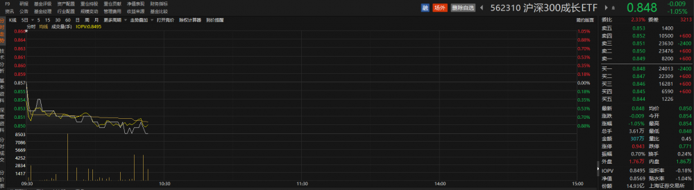 跟踪该指数的沪深300成长ETF(562310)早盘走低,截至发稿,跌幅为1.05%。