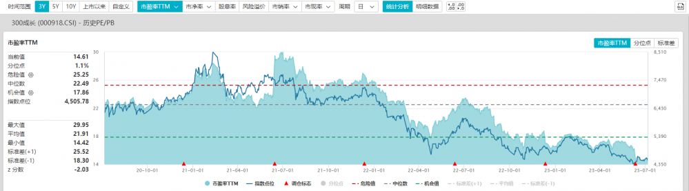 值得注意的是,截至7月6日收盘,沪深 300 成长指数市盈率TTM为14.61倍,位于近3年1.1%的历史分位点,接近3年估值低位。