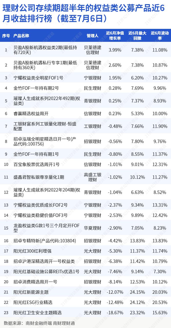 南财理财通数据显示,截至7月6日,在理财公司权益类公募产品近6月收益榜单中,有6只产品录得正收益。具体来看,贝莱德建信理财有2只产品录得正收益,宁银理财、民生理财、青银理财和信银理财各有1只产品录得正收益。