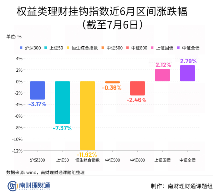 从权益类理财业绩比较基准挂钩指数近6月涨跌幅看,截至7月6日,股票市场指数普遍收跌,沪深300指数、上证50、恒生综指、中证500和中证800分别下跌3.17%、7.37%、11.92%、0.36%和2.46%。而债券指数明显收涨,上证国债和中证全债指数的近6月涨幅为2.12%和2.79%。