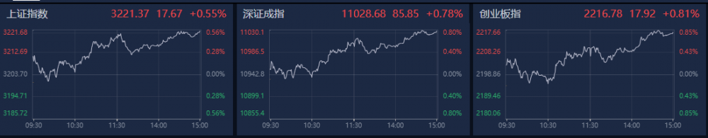 大盘全天震荡反弹,三大指数均小幅上涨。南财金融终端显示,截至收盘,沪指涨0.55%,深成指涨0.78%,创业板指涨0.81%。总体上个股涨多跌少,两市超3500只个股上涨。