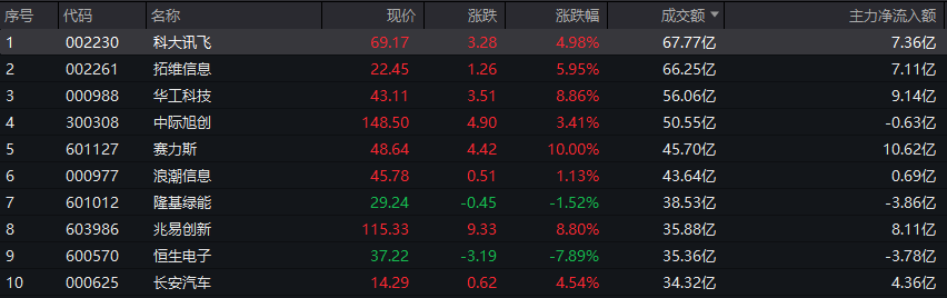 沪深两市今日成交额7737亿,较上个交易日放量123亿。个股方面,科大讯飞以成交额67.77亿元居首,其次是拓维信息,成交额为66.25亿元,此外,华工科技、中际旭创成交额居前。