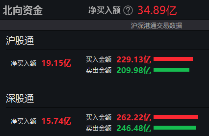 北向资金全天净买入34.89亿元,其中沪股通净买入19.15亿元,深股通净卖出15.74亿元。