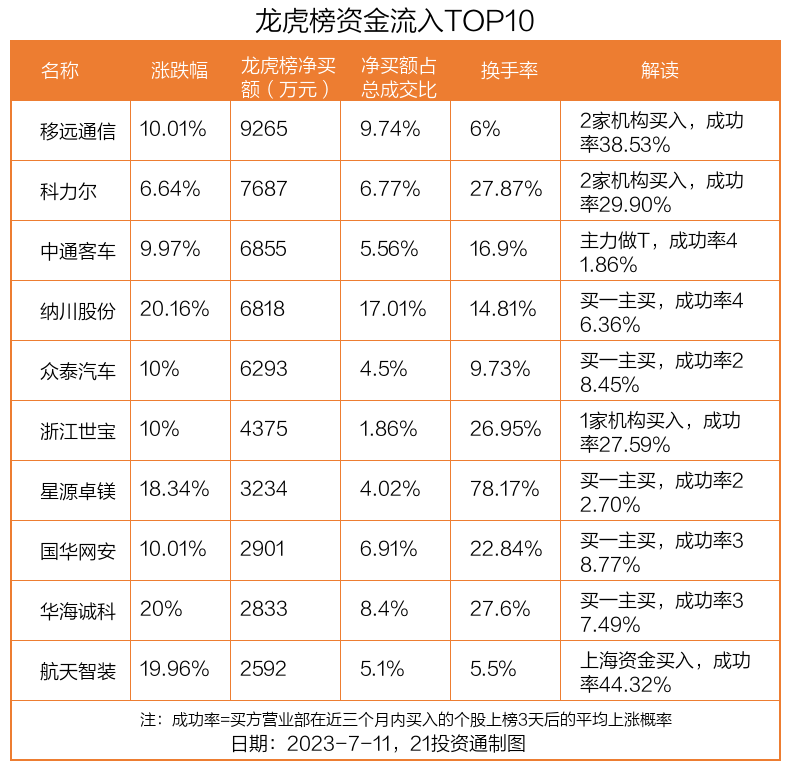 7月11日,上证指数上涨0.55%,深证成指上涨0.78%,创业板指上涨0.81%。盘后龙虎榜数据显示,共有46只个股因当日异动登上龙虎榜,资金净流入最多的是移远通信(603236.SH),达0.93亿元。