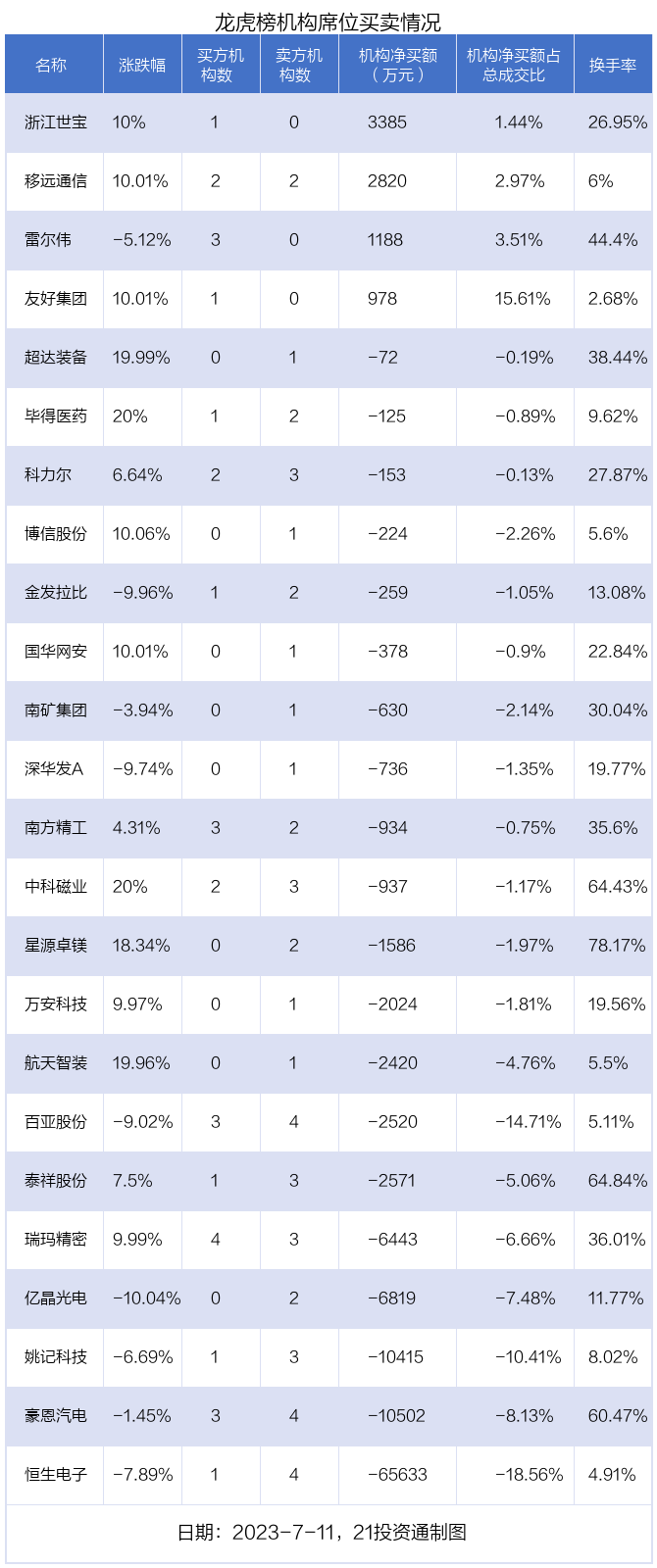 7月11日,24只个股龙虎榜出现了机构的身影,机构合计净卖出10.7亿元。具体来看,机构净买入4股,净卖出20股。