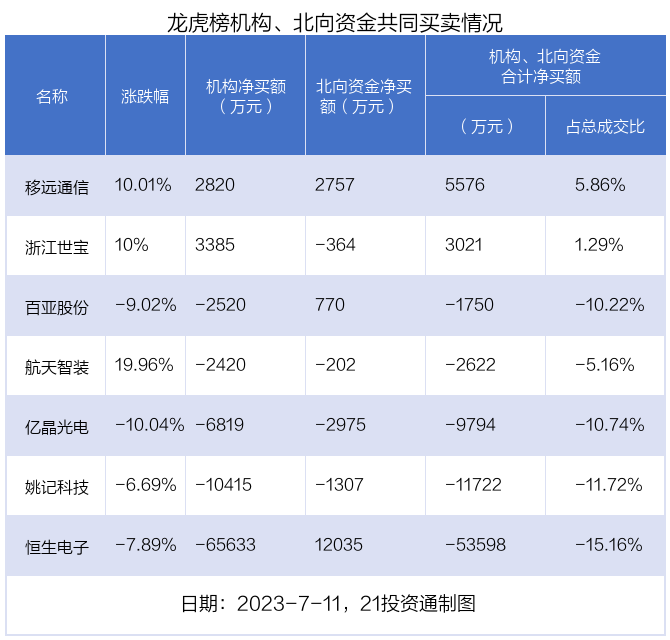 值得注意的是,机构和北向资金共同净买入了移远通信;共同净卖出了航天智装、姚记科技、亿晶光电等3股;在恒生电子,百亚股份,浙江世宝上出现分歧,机构净卖出恒生电子6.56亿元,北向资金净买入1.2亿元;机构净卖出百亚股份2520.13万元,北向资金净买入770.02万元;机构净买入浙江世宝3384.89万元,北向资金净卖出363.83万元。