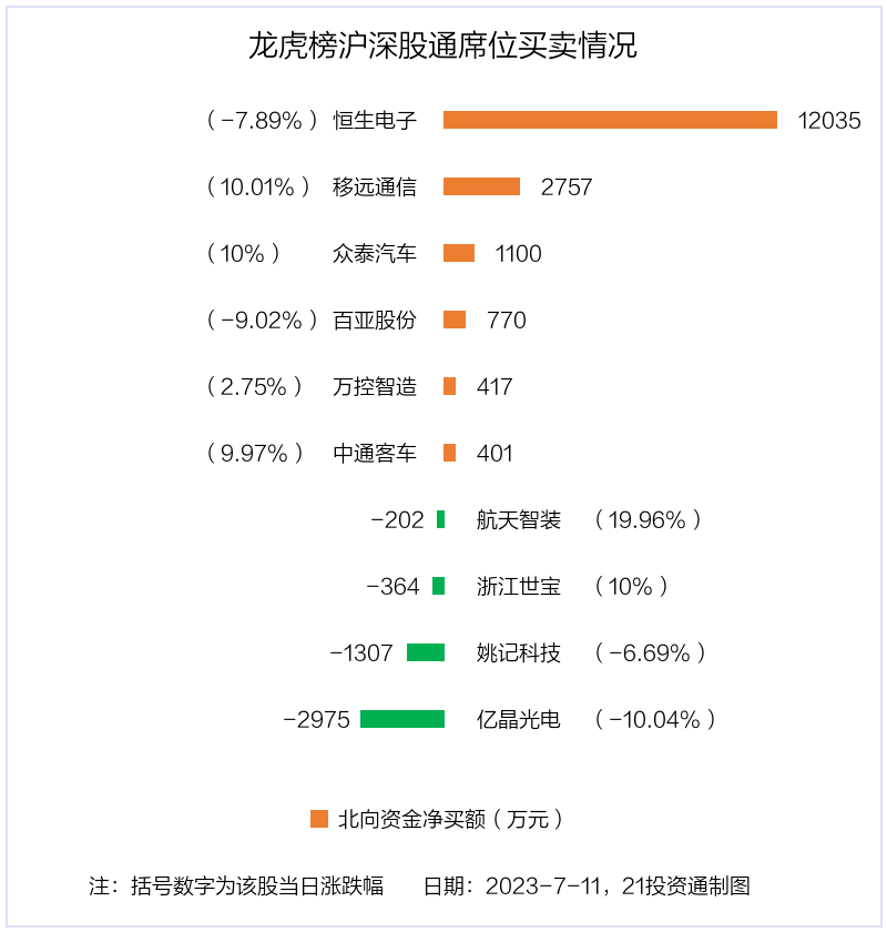 7月11日,北向资金参与龙虎榜中的个股共有10只,合计净买入1.26亿元。其中沪股通净买入3 股,净卖出1 股,合计净买入1.22亿元;深股通净买入3 股,净卖出3 股,合计净买入399.13万元。