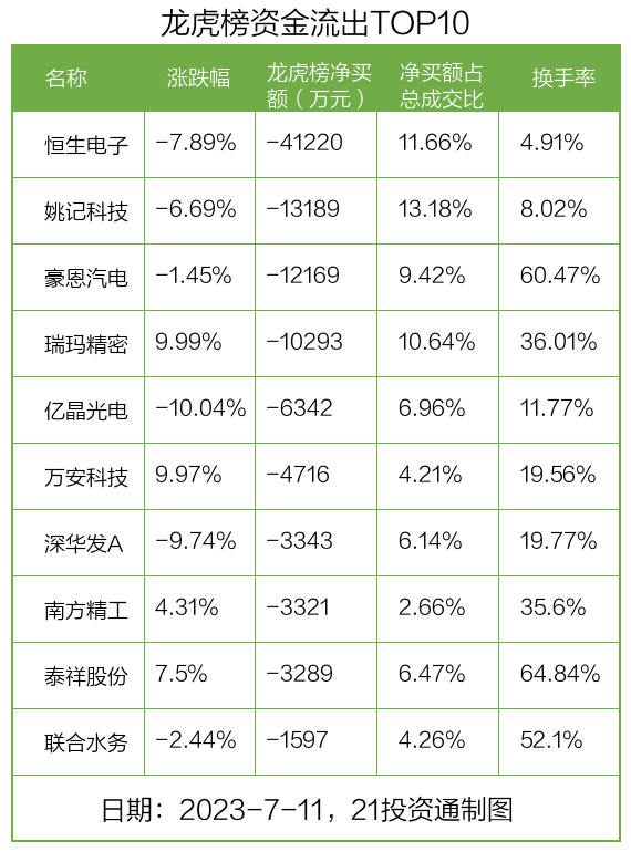 而龙虎榜中资金净流出最多的是恒生电子(600570.SH),被净卖出为4.12亿元,占总成交金额的11.66%。恒生电子收盘下跌7.89%,换手率为4.91%。