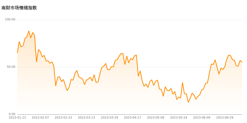 今日南财市场情绪指数为55.0,市场投资热度降低今日南财市场情绪指数为55.0,较前一交易日57.1下跌,市场投资热度降低。