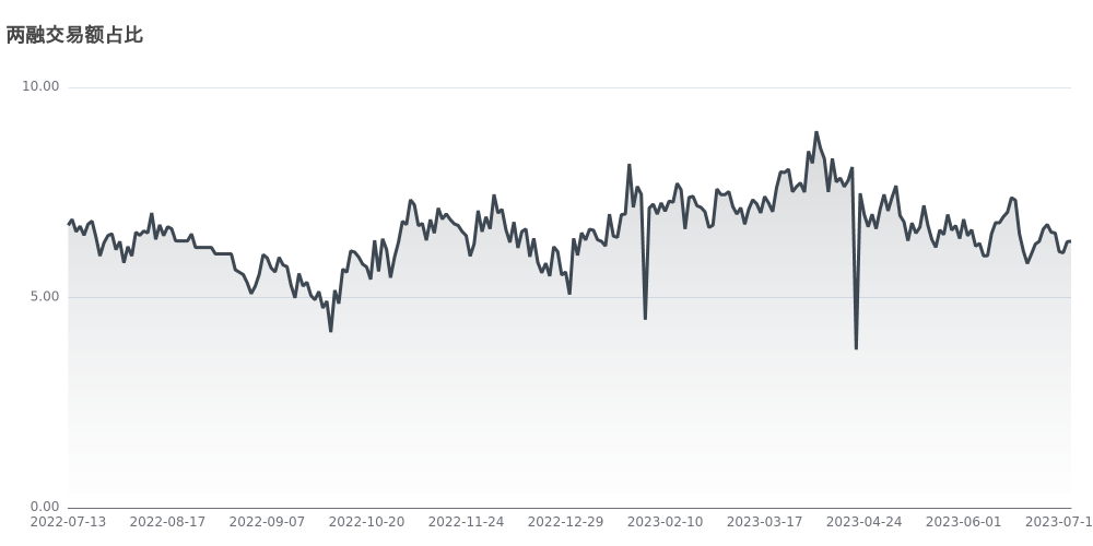今日该指标值为6.34%,目前该指标处于近一年较低区间,说明投资者认为A股市场趋于触底反弹。反映场内投资者借钱炒股的杠杆水平,该指标越高说明杠杆水平越高,即投资者认为当前市场较强,反之则说明投资者认为市场相对较弱,因而与上证指数存在较强的正相关性。