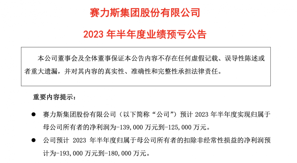 7月14日晚间,赛力斯集团股份有限公司(以下简称“赛力斯”,601127.SH)发布了2023年上半年业绩预告。