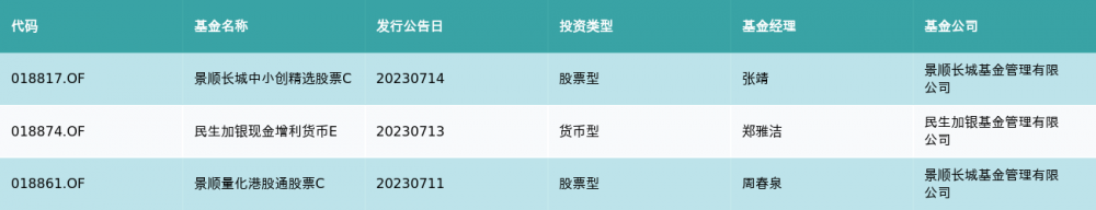 上周有3只新基金发行,分别为:景顺长城中小创精选股票C、民生加银现金增利货币E、景顺量化港股通股票C,详情见下表: