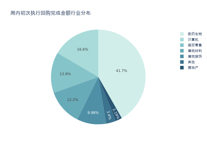 按照初次执行金额所在不同行业分布,金额最高的3个行业分别为:医药生物、计算机、商贸零售,详情见下图:
