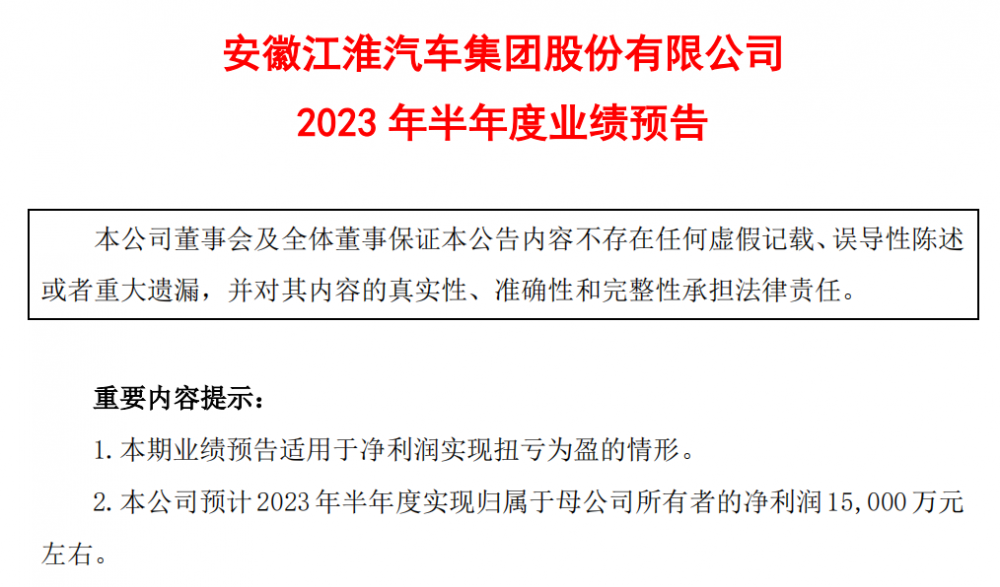 江淮汽车预计,2023年半年度实现归属于母公司所有者的净利润1.5亿元左右,与上年同期(法定披露数据)相比,将增加8.6亿元左右,将实现扭亏为盈。预计2023年半年度实现归属于母公司所有者的扣除非经常性损益后的净利润为亏损2.4亿元左右,与上年同期相比,将增加8.4亿元左右。