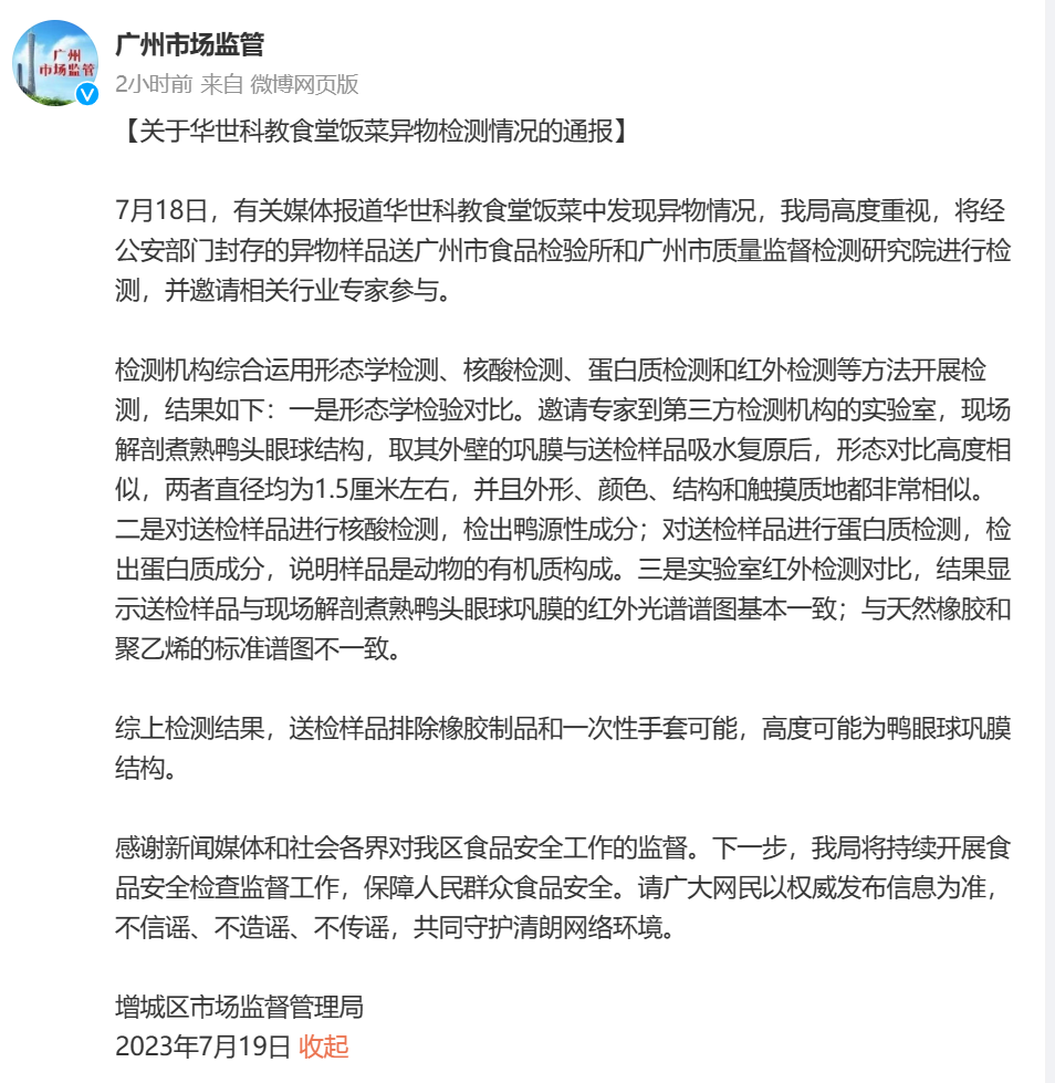 7月19日,广州市场监管局官方微博发布“关于华世科教食堂饭菜异物检测情况的通报”,检测结果表明,送检样品排除橡胶制品和一次性手套可能,高度可能为鸭眼球巩膜结构。
