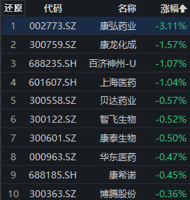A股医药板块今日早盘小幅走低。相关指数中,中证创新药产业指数(931152)小幅下跌,成分股涨跌互现。截至发稿,成分股下跌个股中,康弘药业跌超3%,康龙化成、百济神州-U、上海医药跌逾1%,贝达药业、智飞生物、康泰生物等跟跌;上涨个股中,仅东诚药业涨超1%。