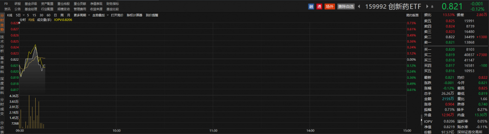 跟踪该指数的ETF中规模最大的创新药ETF(159992)早盘震荡,盘中多次出现溢价交易。截至发稿,跌幅为0.12%,溢折率为0.05%,成交金额超2100万元。