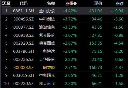 下跌方面,人工智能概念股金山办公跌超4%,中科创达、浪潮信息、紫光股份跌超3%,德赛西威、科博达、大华股份、同花顺、中科曙光、科大讯飞等均跌超2%。