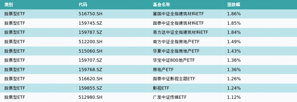 昨日股票型ETF涨幅最高的3支ETF及其收益率分别为:富国中证全指建筑材料ETF(1.86%)、国泰中证全指建筑材料ETF(1.85%)、易方达中证全指建筑材料ETF(1.84%)。涨幅前10详情见下表:
