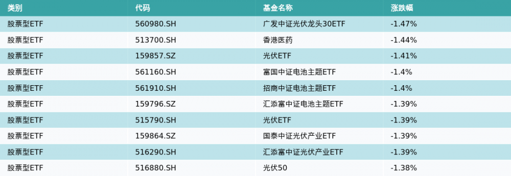 昨日股票型ETF跌幅最大的3支ETF及其收益率分别为:广发中证光伏龙头30ETF(-1.47%)、香港医药(-1.44%)、光伏ETF(-1.41%)。跌幅前10详情见下表: