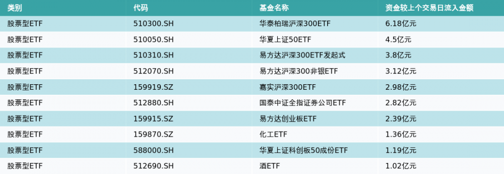 昨日股票型ETF资金流入最多的3支ETF及其流入金额分别为:华泰柏瑞沪深300ETF(流入6.18亿元)、华夏上证50ETF(流入4.5亿元)、易方达沪深300ETF发起式(流入3.8亿元)。资金流入前10详情见下表: