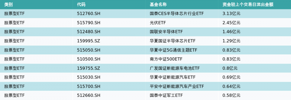 昨日股票型ETF资金流出最多的3支ETF及其流入金额分别为:国泰CES半导体芯片行业ETF(流出3.13亿元)、光伏ETF(流出2.45亿元)、国联安半导体ETF(流出1.46亿元)。资金流出前10详情见下表: