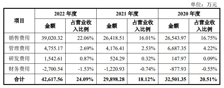 值得注意的是,敷尔佳在产品的销售板块投入巨大。2020年至2022年,敷尔佳的销售费用分别为2.65亿元、2.64亿元和3.9亿元,占同期的营收比例分别为16.75%、16.01%和22.06%。而在销售费用中,宣传推广费占比最高位居榜首,报告书显示,2020年至2022年的宣传推广费分别为1.66亿元、2.36亿元和3.54亿元,占销售费用的比例分别为62.62%、89.26%和90.63%。