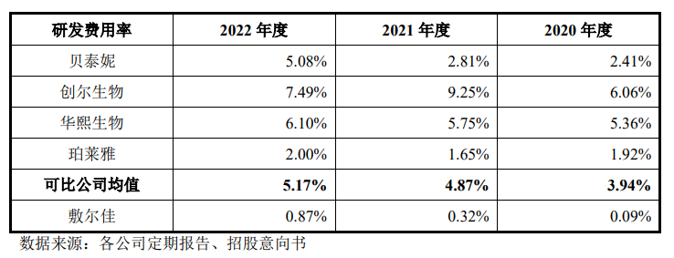 敷尔佳在报告中表示,公司的研发费用占营业收入比例较低,主要是由于公司上市销售的多款新产品均基于原材料成品进行的配方、配比及原材料选择方向的研究,与此同时,公司还有非特殊化妆品研发、已有产品升级及性能检测等日常研发活动,故研发支出较小;而同行业可比公司的研发活动多涉及原料的研发和提取、工艺开发及临床研究类研发项目等,研发费用较高。