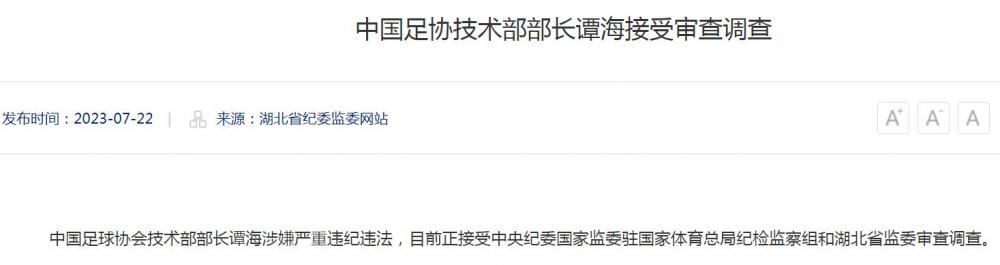 中国足球协会技术部部长谭海涉嫌严重违纪违法,目前正接受中央纪委国家监委驻国家体育总局纪检监察组和湖北省监委审查调查。