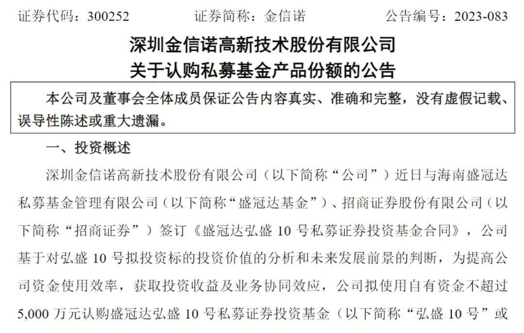 近日,金信诺公告称,已与海南盛冠达私募基金管理有限公司、招商证券股份有限公司签订《盛冠达弘盛10号私募证券投资基金合同》,公司拟使用自有资金不超过5000万元认购盛冠达弘盛10号私募证券投资基金。