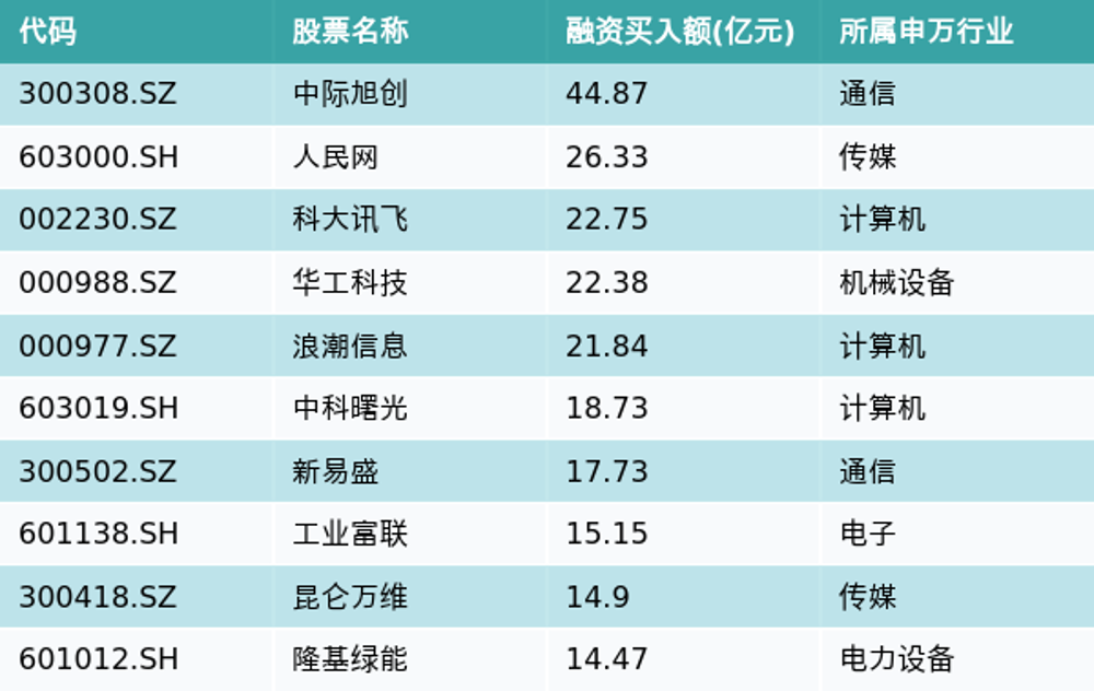 上周两市共有3240只个股有融资资金买入,共有17只个股买入金额超10亿元,其中中际旭创、人民网、科大讯飞排名前三,买入金额分别44.87亿元、26.33亿元、22.75亿元。融资买入额前10个股详情见下表:
