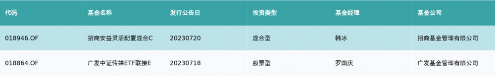 上周有2只新基金发行,分别为:招商安益灵活配置混合C、广发中证传媒ETF联接E,详情见下表: