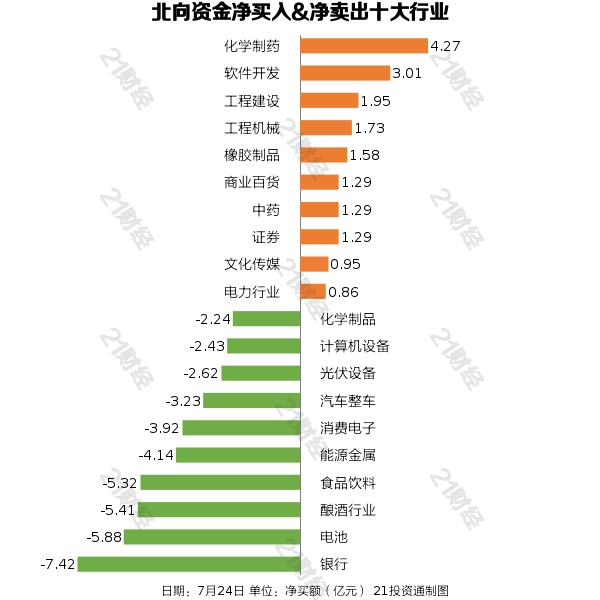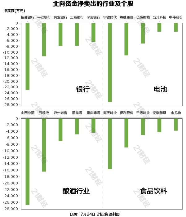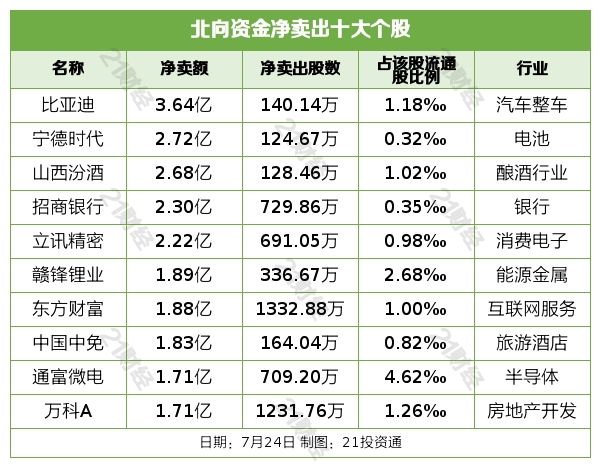 据21投资通智能监测,7月24日,北向资金净卖出51.43亿元,其中沪股通净卖出6.59亿元,深股通净卖出44.83亿元。