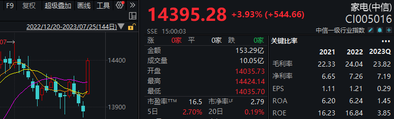 7月25日,家电板块走强,家电(中信)指数上涨3.93%,成份股中,亿田智能涨超13%,老板电器涨停,火星人涨超9%,极米科技、格力电器、帅丰电器、海尔智家、奥普家居涨超5%。