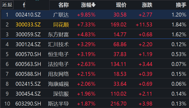 涨幅方面,广联达盘中一度触及涨停,现涨近10%,同花顺涨超7%,第一大权重股东方财富涨近5%,第四大权重股汇川技术、恒生电子、法拉电子等跟涨。