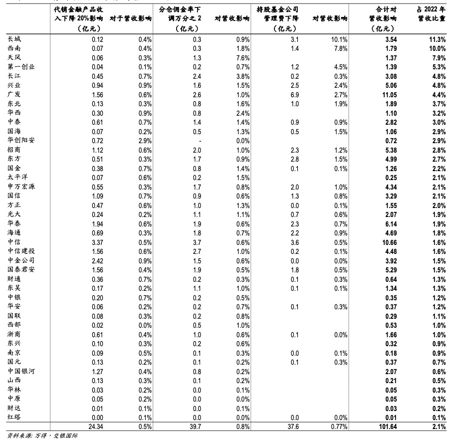 有券商分析师给出测算,以2022年为基数,将股混基假设佣金率以万五计算,指数型基金以万 2.5计算,其他基金佣金率维持不变。这样计算出来公募基金总佣金收入由188.4亿元降至119.3亿元,下滑37%。