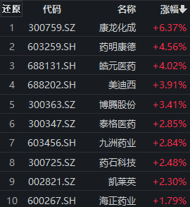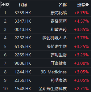 港股方面,截至发稿,医疗医药股普涨。相关指数中,中证港股通医药卫生综合指数 (930965) 早盘一度涨超2%,随后涨幅有所收窄。截至发稿,成分股中,康龙化成涨近7%,泰格医药涨超4%,和黄医药、微创机器人-B、康希诺生物、药明生物、叮当健康、3D Medicines、药明康德涨逾3%。