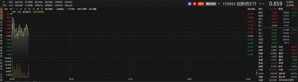 跟踪该指数的ETF中规模最大的创新药ETF(159992)早盘震荡,盘中出现溢价。截至发稿,该ETF价格与前一交易日持平,溢折率为0.01%,成交金额近1.3亿元。