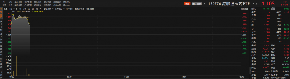 跟踪该指数的港股通医药ETF(159776)盘中一度冲高。截至发稿,该ETF涨幅为1.01%,成交金额近2500万元。