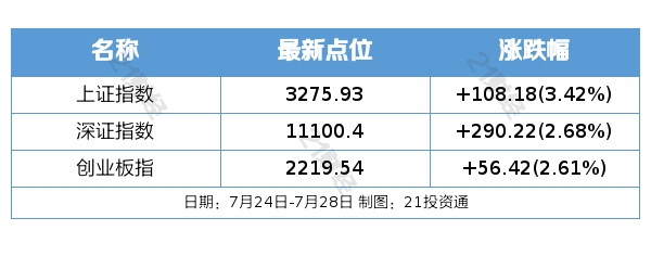 过去一周(7月24日-7月28日),A股三大指数震荡走强,其中7月28日均大涨超1.6%。截至最新(7月28日)收盘,沪指报3275.93点,周涨3.42%;深成指报11100.40点,周涨2.68%;创业板指报2219.54点,周涨2.61%。