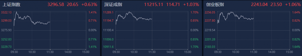 三大指数早盘冲高,深证成指、创业板指涨幅超1%。南财金融终端显示,截至上午收盘,上证指数涨0.63%,深证成指涨1.03%,创业板指涨1.06%。沪深两市个股涨多跌少,近3600只个股上涨。