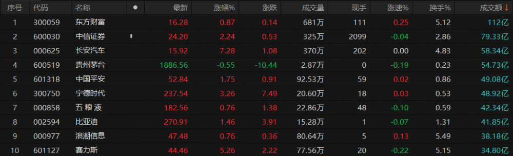 沪深两市半天成交额7409亿元,较上一交易日同期放量2206亿元。个股方面,截至午间收盘,东方财富成交额排名第一,达112亿元;中信证券、长安汽车、贵州茅台成交额在50亿元以上,分别为79.33、58.34、54.73亿元。