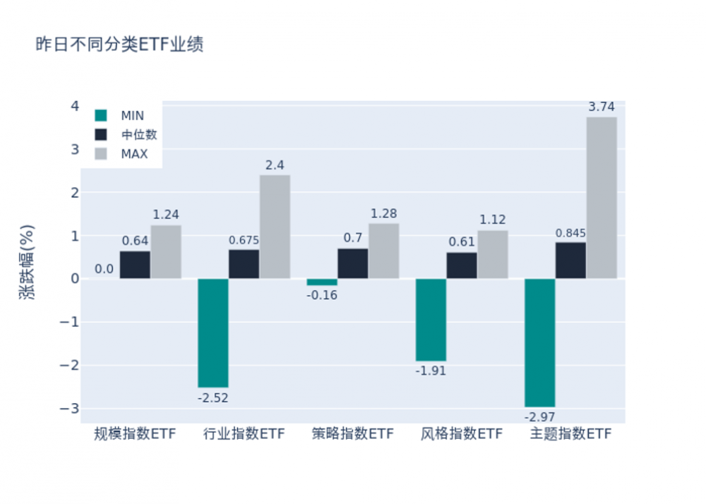 昨日股票型ETF收益率中位数为0.67%。其中按照不同分类,规模指数中华夏中小企业100ETF收益率最高,为1.24%;行业指数中国泰中证800汽车与零部件ETF收益率最高,为2.4%;策略指数中嘉实深证基本面120ETF收益率最高,为1.28%;风格指数中招商中证银行AH价格优选ETF收益率最高,为1.12%;主题指数中广发中证全指汽车ETF收益率最高,为3.74%。