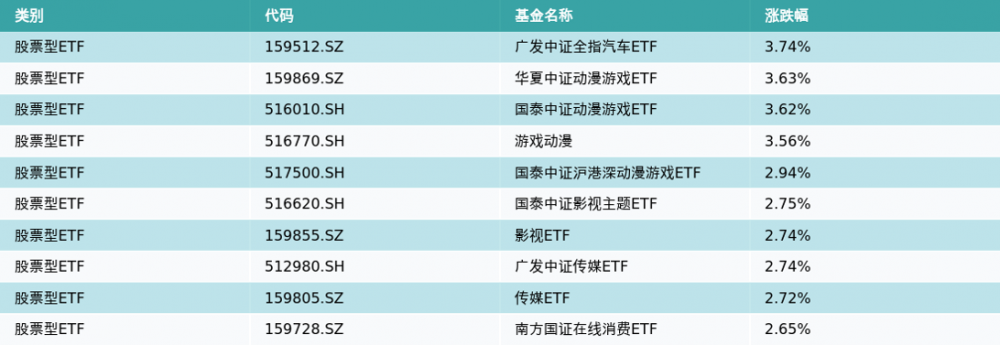 昨日股票型ETF涨幅最高的3支ETF及其收益率分别为:广发中证全指汽车ETF(3.74%)、华夏中证动漫游戏ETF(3.63%)、国泰中证动漫游戏ETF(3.62%)。涨幅前10详情见下表: