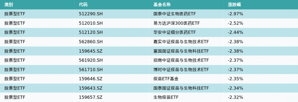 昨日股票型ETF跌幅最大的3支ETF及其收益率分别为:国泰中证生物医药ETF(-2.97%)、易方达沪深300医药ETF(-2.52%)、华安中证细分医药ETF(-2.44%)。跌幅前10详情见下表: