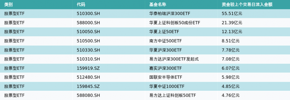 昨日股票型ETF资金流入最多的3支ETF及其流入金额分别为:华泰柏瑞沪深300ETF(流入55.51亿元)、华夏上证科创板50成份ETF(流入21.39亿元)、华夏上证50ETF(流入12.13亿元)。资金流入前10详情见下表: